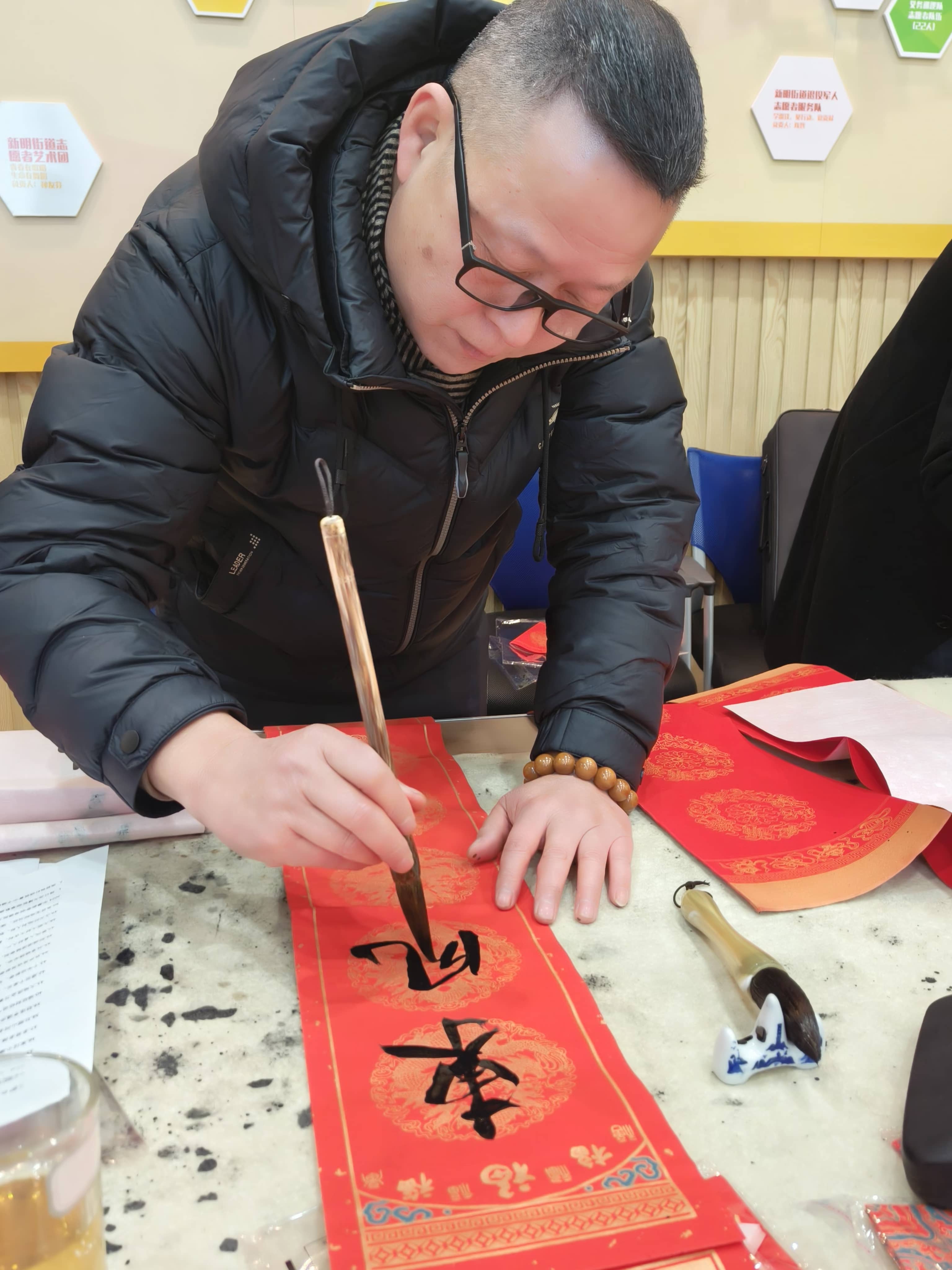 在活動的精彩環節,書法家們滿懷熱情,揮毫潑墨,創作出一個個充滿神韻的“福”字和寓意吉祥的春聯。這些滿載祝福的藝術作品,不僅是對中華優秀傳統文化的傳承,更是對美好幸福生活的向往。主辦方將這些作品送到社區群眾和10位最美志愿者手中。